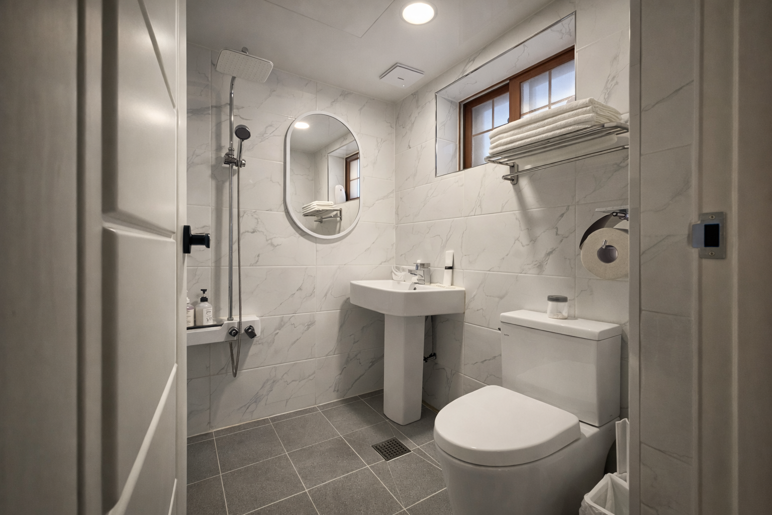 *욕실- 세면대, 샴푸, 바디워시, 타월, 드라이기