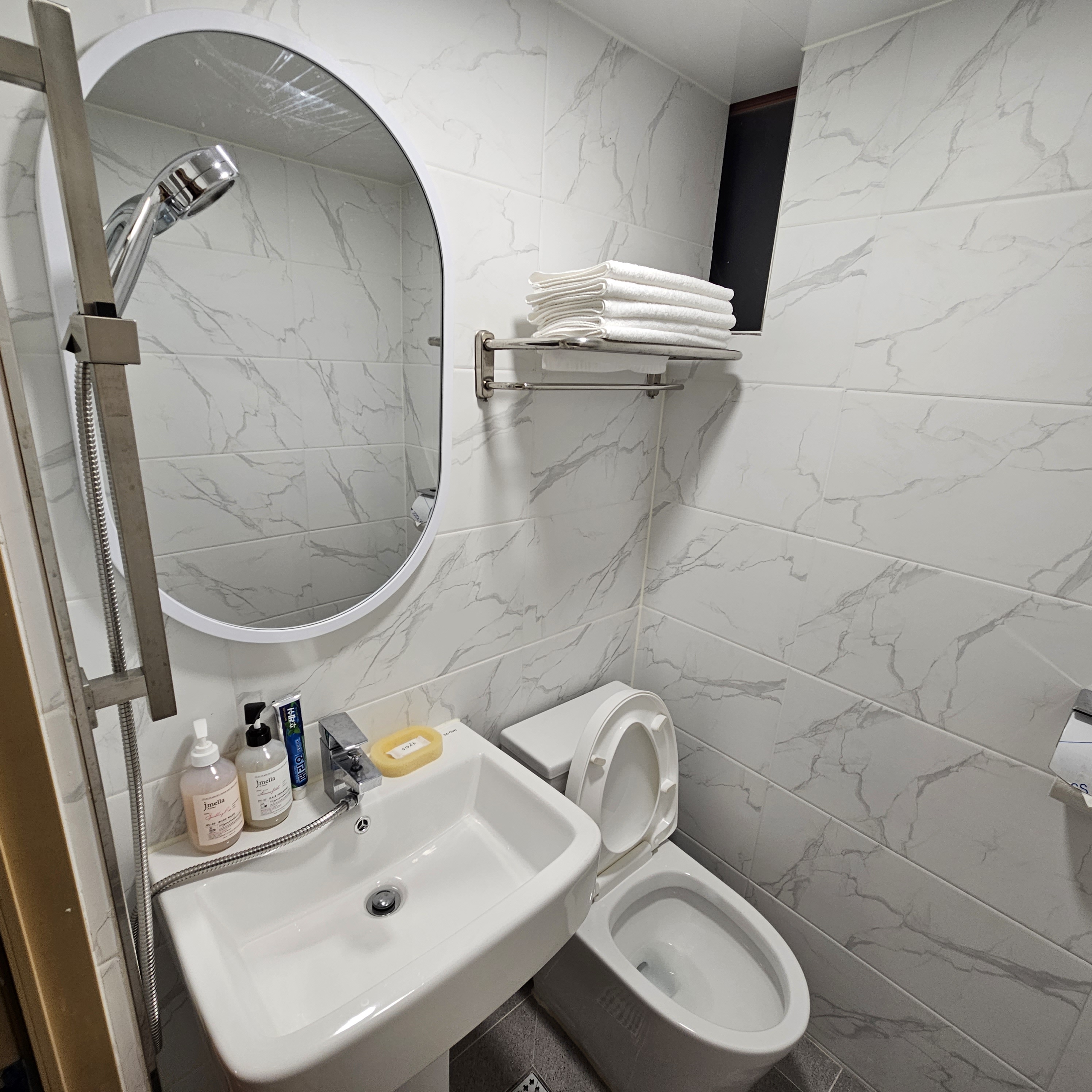 *욕실- 세면대, 샴푸, 바디워시, 타월, 드라이기