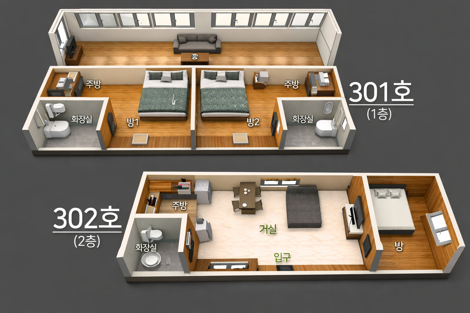 * 퇴실시 객실정리 및 음식물을 비롯한 모든 쓰레기는 꼭 분리수거 부탁드립니다.(현관으로 내어주시면 감사합니다)