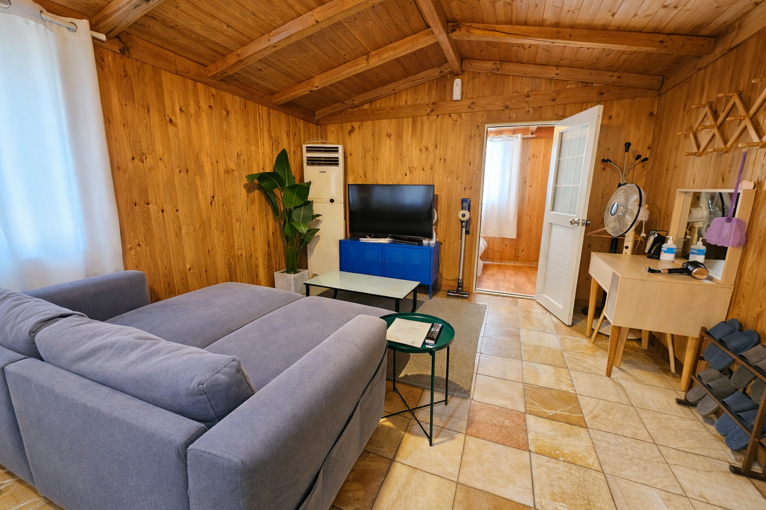 *거실겸/주방 - 쇼파, 에어컨 , 가스레인지 ,전자레인지, 냉장고, 식기세트, 조리도구, 오프너, 밥솥, 에프킬라, 모기향, 오프너